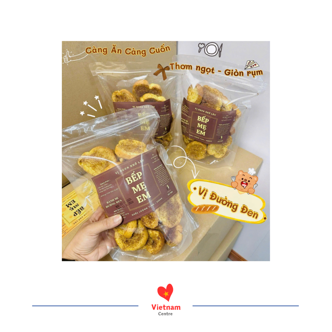Bánh mì đường đen Bếp mẹ em là loại bánh mì sấy khô, giòn rụm, được nhiều người ưa chuộng. Sản phẩm này nổi bật với hương vị đường đen đậm đà và vị bơ thơm béo.